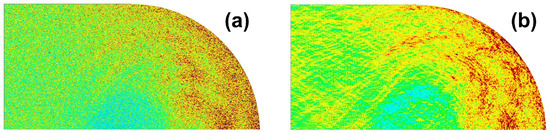 Figure 8 shows the histogram of the overlap C for the cardioid billiard, where most of the overlap values are found between and . The functional form of the histogram is found to be universal for fully chaotic billiards [32,48]. For the elliptic billiard, the overlap C can take a smaller value and is distributed over a wider range. These results indicate that almost all resonance wave functions of the cardioid billiard lasers are similarly distributed inside the billiard, whereas the resonance wave functions of the elliptic billiard lasers exhibit various spatial patterns inside the billiard [31,33,48]. On the basis of quantum-classical correspondence in the semiclassical regimes, it is expected that the shorter the wavelength, the more distinct the histograms between fully chaotic and integrable billiards. This means that the effects caused by the spatial distributional difference of the resonances between fully chaotic and integrable billiards are expected to be more prominent for larger billiard lasers.