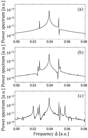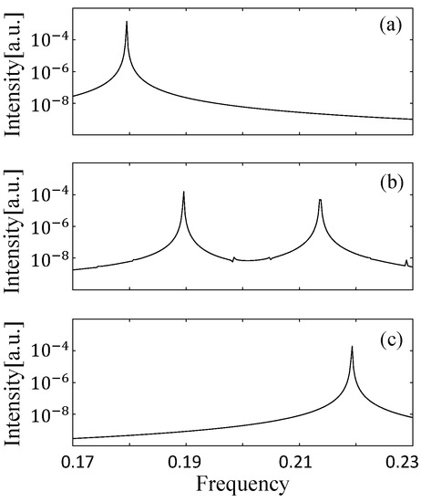 We investigate the dynamics of the D-shaped billiard laser by changing the gain center in the SB model simulation with the fixed pumping power . The size and deformation parameters of this billiard are and , respectively, and the distribution of the resonances in the complex frequency plane is shown in Figure 16. When the gain centers are 0.181 and 0.22, the power spectra have single peaks, respectively corresponding to the locked state of the resonances A and B and the locked state of the resonances C and D as shown in Figure 17a,c. When the gain center is 0.206, the two locked states simultaneously appear in the power spectrum as shown in Figure 17b. This is explained by the fact that the net gains of two locked states are larger than those of the resonances around 0.206. Consequently, two distinct peaks are simultaneously observed in the spectra, which correspond to the experimental results shown in Figure 15.