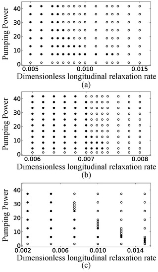 where and respectively represent the dimensionless transversal and longitudinal relaxation rates, and represents the gain center, and is the transition frequency of the two-level atoms, and represents the dimensionless couple strength. represents the external pumping power. The set of Equations (1)–(3) is called the Schrödinger–Bloch (SB) model [1,6,8,9,14]. The SB model can be numerically solved by the split-operator method (or so-called symplectic-integrator method). Therefore, it is more convenient for numerical simulations than the Maxwell–Bloch model.