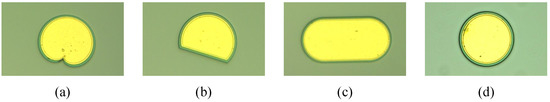 Optical microscope images of the fabricated lasers of (a) the cardioid billiard (R = 35 m), (b) the D-shaped billiard (R = 40 m, d = 20 m), (c) the stadium billiard (R = 50 m), and (d) the circular billiard, i.e., microdisk (R = 40 m).