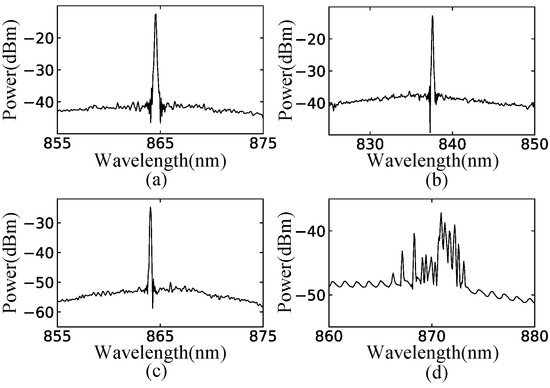 To measure the optical spectra of the semiconductor billiard lasers, the emitted light was collected with anti-reflection-coated lenses and coupled to a multimode optical fiber via a 30 dB optical isolator. The multimode optical fiber was coupled to a spectrum analyzer (Advantest Q8347). Figure 12 shows the measured spectra of the semiconductor billiard lasers. Every spectrum of three different fully chaotic billiard lasers has a single peak with the injection currents much larger than their thresholds as shown in Figure 12a–c, whereas the spectrum of the integrable billiard (microdisk) laser has more than 10 peaks as shown in Figure 12d. The appearance of a single lasing peak in the spectra of the semiconductor fully-chaotic billiard lasers can be more convincingly confirmed with the high-resolution mode of the spectrum analyzer with wavelength interval of 0.002 nm. As shown in Figure 13, a narrow linewidth peak was measured in the semiconductor D-shaped billiard lasers.