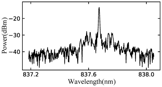 A spectrum obtained by using the spectrum analyzer in high-resolution mode with wavelength interval of 0.002 nm in the experiment of the semiconductor D-shaped billiard laser with the injection current 200 mA.