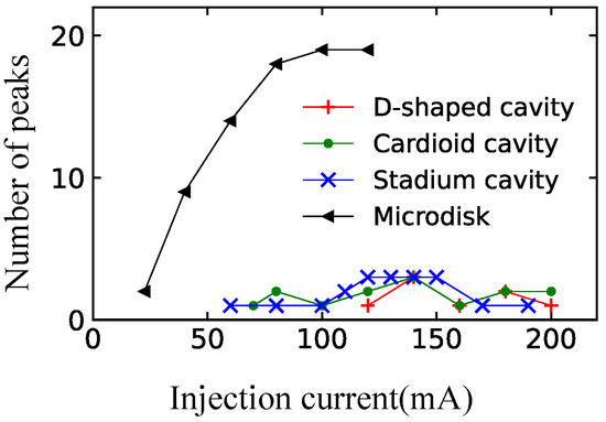 To gain further insight in the spectral characteristics, we counted the number of the peaks whose intensities were larger than −35 dB of the maximum peak intensity in each spectrum. Figure 14 shows the injection–current dependence of the numbers of peaks in the spectra. From Figure 14, one can see that the number of the lasing modes in a fully chaotic billiard laser is distinctly different from that of the integrable one when the injection currents are much larger than their thresholds. Similar experimental results were reported for the semiconductor stadium and elliptic billiard lasers with various aspect ratios [32]. Accordingly, we conclude that this phenomenon is universal and independent of the details of billiard lasers. Thus, the universal single-mode lasing in fully chaotic billiard lasers is verified experimentally.