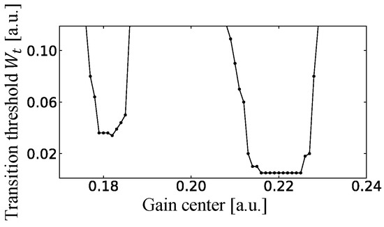 Finally, the pumping power as well as the gain center are increased. Even if the position of the gain center is located between the real parts of the resonances B and C, one of the two locked states corresponding to the two peaks in Figure 17b wins the mode competition and becomes a single-mode lasing state with large pumping power. We define this transition threshold as the value of the pumping power where the lasing state changes from the multi-mode to the single-mode lasing state. The gain center dependence of is shown in Figure 18. is small when the gain center is near the low-loss resonances such as 0.181 and 0.22. However, it becomes extremely large when the gain center is the midpoint between these two values, and we could not obtain the single-mode lasing state by the SB model simulation because the net gains of the locked state of A and B and the locked state of C and D are equally large. If the size of the billiard is much larger, the resonance distribution is much more dense. Therefore, the two-mode lasing regime in the pumping power is expected to be small in large fully-chaotic billiard lasers. However, when the injection current is large, the temperature of the upper contact layer might be very high due to the resistance there, and hence, the lower Peltier device might operate to cool the laser from the bottom and the whole situation might become a highly non-equilibrium state, which could result in the fluctuation of the gain center. Therefore, it might be inevitable to observe a couple of peaks occasionally in the spectra of the semiconductor fully-chaotic billiard lasers, which is the effect of the combination of the universal single-mode lasing and the fluctuation of the gain center.