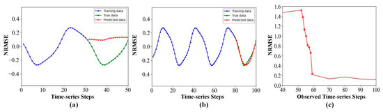 Time-series forecasting is a critical ingredient in many fields, such as computational biology [1,2], finance [3], traffic flow [4], and geoscience [5]. However, due to the limited measurement conditions, we usually can only obtain short-term time-series samples [6]. On one hand, since a short-term dataset has no sufficient information, it becomes a challenging task to carry out accurate multi-step-ahead prediction using a short-term time-series. On the other hand, we can measure high-dimensional data in many real-world systems, which include rich information of the dynamics on the target variable and thus can be exploited to compensate the insufficiency of the short-term data. However, there is the curse of dimensionality in effectively analyzing and predicting high-dimensional time-series [7]. As an empirical example, Figure 1 shows the prediction results on the 64-dimentional pendulum datasets from fewer observed time-series steps (50 steps, Figure 1a) to enough observed time-series steps (100 steps, Figure 1b). Figure 1c shows the forecasting metric variation with observed time-series steps. When there are fewer observed data, the NRMSE shows unsatisfactory performance, and the prediction model fails.