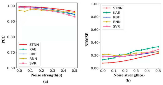 The robustness of five methods (STNN, KAE, RBF, RNN and SVR). (a) The forecasting metric PCC variation with noise strength. (b) The forecasting metric NRMSE variation with noise strength.
