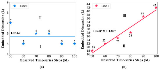 Figure 5a intuitively presents the two embedded dimension points. With the increase in the observed time-series steps, the coordinates of the three embedded points form lines 1 and 2, which divide the embedded dimension into three areas (I, II, and III).