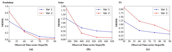 Figure 7 details the forecasting metric (NRMSE) variation with the observed time-series steps (M). As the observed time-series steps increase, Figure 7 shows that the NRMSE is decreasing on pendulum data, solar data, and TS data. Therefore, we can conclude that more observed data can provide more temporal information for STNN prediction, thus improving the prediction accuracy of STNN.