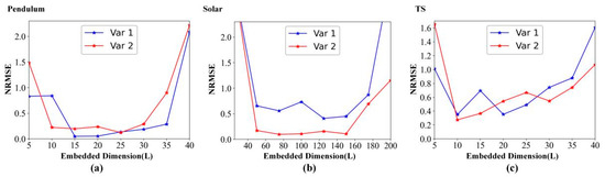 Figure 9 details the forecasting metric (NRMSE) variation with the embedded dimension (L). As the embedded dimension increases, Figure 9 shows that the NRMSE decreases first and then increases with the increase in the embedded dimension on pendulum data, solar data, and TS data, which is consistent with the previous discussion in Section 4.3.2.