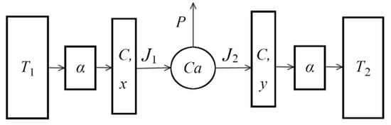 Since the Curzon–Ahlborn paper, published in 1975 [1], the so-called finite-time thermodynamics (FTT) started its development as a branch of classical equilibrium thermodynamics. Diverse ways and methods to qualify the performance of the Curzon and Ahlborn engines and other heat engines have been obtained [2,3,4,5,6,7]. One of the main objectives of FTT is the analysis of the optimal operation of thermal engines to obtain new operating limits of efficiency and power output in thermal devices. That is, there was no thermal equilibrium between the working fluid and the thermal reservoirs in the isothermal branches of the cycle. Curzon and Ahlborn (CA) showed that such a heat engine provides nonzero power, positive entropy production, and a more realistic efficiency than the Carnot engine. In Figure 1, we show the representation of a CA engine, in which and are the temperature of the heat reservoirs with , and are the heat fluxes of the engine through thermal conductors, both with the same conductance () and the same heat capacity (C), and and are the hot and cold temperatures of the Carnot cycle isothermal branches, respectively.