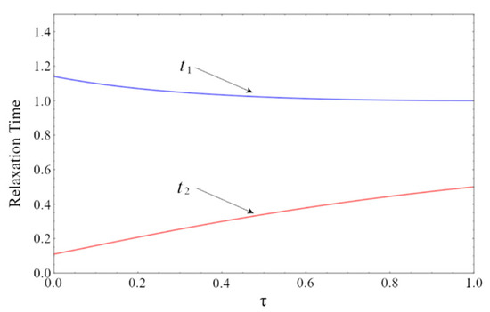 Following Páez-Hernández et al. [9] step by step, both eigenvalues have negative real parts, which implies that the system’s steady state is a stable node, and allows us to define relaxation times , i = 1, 2. The time evolution of a given perturbation from the steady state is generally determined by both relaxation times. However, the perturbation long-term behavior is dominated by the longest relaxation time. In Figure 3, the relaxation times and are plotted against . Notice that for all values of , that is a monotone-increasing function of , and that has a maximum at and a minimum at .