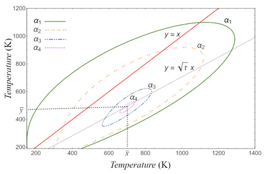 Now, by substituting Equations (19)–(21) into Equations (17) and (18), we obtain the following expressions in terms of the temperatures, , and ,