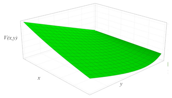 Figure 4 shows that surfaces and , which result from solving Equation (33), do not intersect at any point.