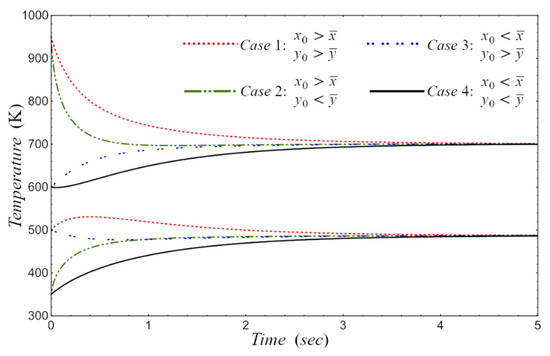 In the numerical analysis shown in Figure 7, the initial state is , and we consider the following cases: (1) , ; (2) , ; (3) , ; and (4) , . For all cases analyzed, it is observed that they tend to the value of the steady state of the temperature.
