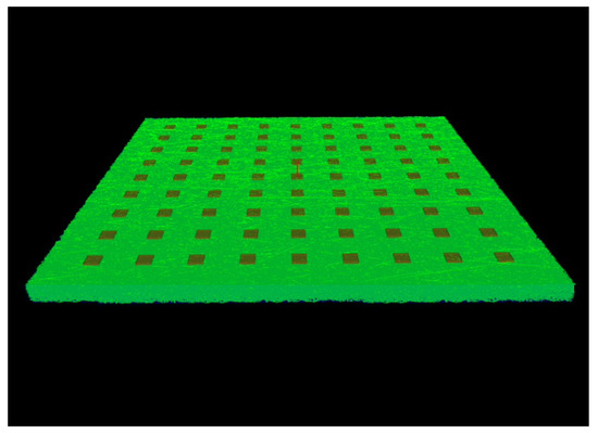 The simulated detector plate can be seen in Figure 1. In this figure, the red squares represent SiPMs, and the green surface represents the scintillator area. According to our setup, the SiPMs face the top of the detector plate. A symmetrical placement of SiPMs on both axes is followed as the plate is square-shaped.