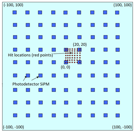 We simulated muon hits only on one specific area, instead of the whole surface. Figure 2 shows the simulated hit locations as red points. We chose the hit locations only in this limited area to save computation time, as the system is periodically invariant by translation. Muons are emitted perpendicular to the detector surface in a grid with a step of 1 mm. Therefore, we created 441 different hit positions. For each hit position, we simulated around 10,000 hits. Our total simulated hit count added up to 4,416,335 (∼441 × 10,000). When a muon hits the detector plate, the scintillation light spreads in the plate and is detected by SiPMs. We saved the signal amplitudes from SiPMs and hit coordinates (x, y) for each hit. Thus, we created a dataset of hit coordinates and corresponding signal amplitudes. Sensors are placed in the middle of the plate from the side view. Therefore, when a muon hits the exact location of the sensor, it causes a light to be produced on the plate as usual. The sensor at the hit location ends up with the highest signal amplitude, since it is the closest to the source.