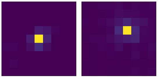 It is possible to treat each signal amplitude as a pixel and show the illumination from a single-particle hit as an image. This way, we present the samples from (0, 0) and (20, 20) in Figure 3. From the samples, it can be seen that as the hit coordinate changes, the illumination output changes. To show an obvious change, we demonstrated outputs of hits on (0, 0) and (20, 20) coordinates. Higher signal amplitudes from sensors, i.e., brighter pixels, shift position according to the hit position.