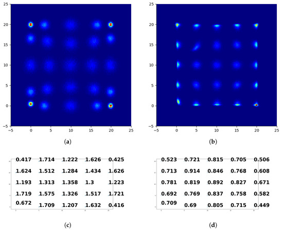 We visualize hit location estimations for some coordinates, i.e., with a 5 mm step, in Figure 6 to have a more detailed comparison between CoG and FCN. The area in this figure represents the red dotted area shown in Figure 2. The dark blue area represents the coordinates where there are no estimations, and the transition from light blue to red represents the increasing number of hits estimated on the respective coordinates. We show only twenty-five hit locations in this display. We did not include all the hit locations used in the experiment here to be able to present the results clearly. However, the results follow the same trend for the other hit locations as well. We present average errors obtained for these locations together with the estimations. Due to a technical issue in our simulation, some of the data at the location have an uncharacteristic distribution of signal amplitudes. To avoid biases from this spurious effect, we utilize hits at instead of to have better clarity on the results, as the results follow the same trend.