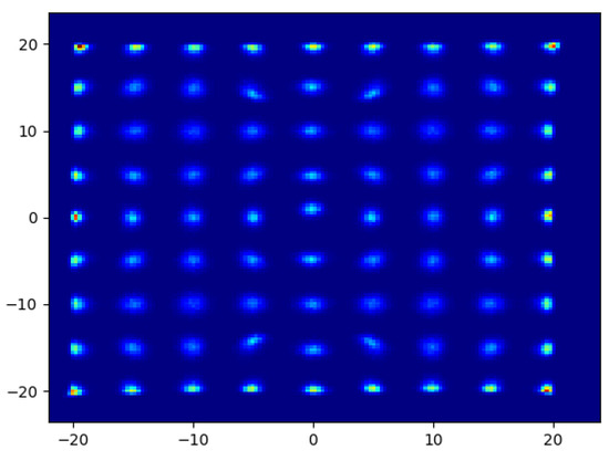 In scintillation detector plates, photosensors are used to detect and transfer muon hit data to a digital context. For example, in a setup with (81) photosensors, the signal amplitude of each photosensor is transferred to the processor, and the data obtained can be considered as a image. According to muon’s hit position, the shape of this image changes (see Figure 3) because different hit positions cause different signal amplitudes on each sensor, since the illumination produced by the plate changes accordingly.