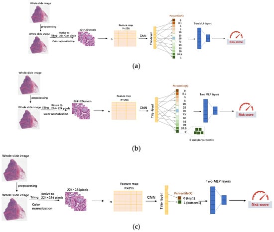 WSIs are usually split into small image patches to train neural networks to predict an outcome of interest. Due to a large number of image patches for each WSI that can vary from hundreds to thousands, and the unavailability of patch-level labels, it is not feasible to directly build a prediction model at the patch level. Zhu et al. and Wulczyn et al. randomly selected patches to train their deep-learning survival models [,]. In addition, unsupervised clustering was utilized to facilitate the identification of the most predictive image patches for survival modeling [,,,]. Furthermore, tumor/stromal regions are often considered the most predictive. Therefore, tissue segmentation models were used to select tumor/stromal patches for model building [,]. Recently, Courtiol et al. proposed MesoNet for survival data which demonstrated that using both the lowest-scored patches and the highest-scoring patches can more accurately predict risk and survival in malignant mesothelioma patients [].