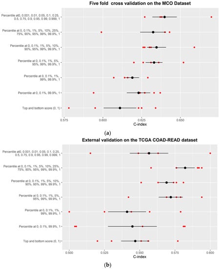 Similarly, the external validation using an independent TCGA COAD-READ dataset demonstrated a similar trend (Figure 2b). In general, the models with more complete distribution (i.e., more middle-scoring patches at different distribution percentiles in addition to the highest/lowest scoring patches) provide a higher C-index compared to those with less complete distribution (e.g., only the highest and lowest scoring patches). As expected, the external validation with the independent dataset produced more heterogeneous results and a lower C-index compared to the cross-validation, since the TCGA dataset does not completely resemble the MCO CRC dataset. Nevertheless, the external validation with the TCGA dataset still preserved the overall trend wherein a more complete distribution of the patch scores provided better predictive ability than the extreme top/bottom instances alone.