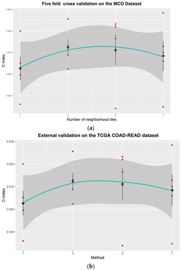 Figure 3 clearly shows that multiple instances outperformed the single instance at each percentile. For the cross-validation using the MCO CRC dataset, the average C-index was improved from 0.640 to 0.645 when the number of instances at each percentile increased from one to three (Figure 3a). The average C-index increased to 0.647 with five neighborhood instances, and the improvement appears to level off with more neighborhood instances (i.e., seven). A similar pattern was observed with the independent TCGA dataset. The average C-index plateaued (0.580) when the number of instances at each percentile increased to three. Therefore, consistent with Zhu et al.’s findings, multiple neighborhood instances at each percentile can improve the model performance []. However, experiments may be needed to determine the optimal number of instances for different tasks and models.