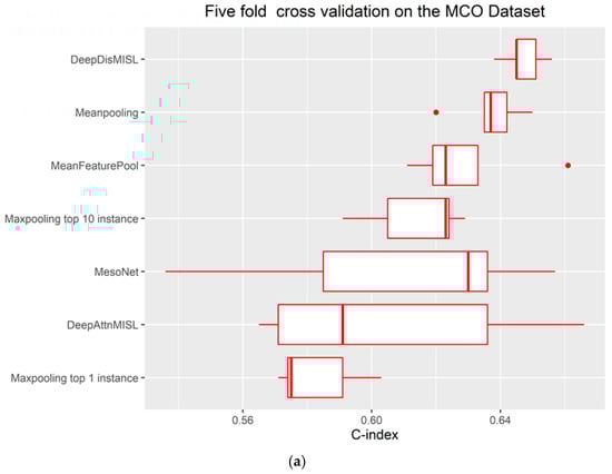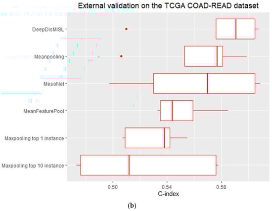 We also systematically compared our proposed DeepDisMISL with six existing models: MesoNet, DeepAttnMISL, Meanpooling, Maxpooling (Top 1 instance), Maxpooling (Top 10 instance), and MeanFeaturePool [,]. DeepDisMISL was not only superior to MesoNet but also outperformed the most recently-published state-of-the-art DeepDisMISL. The mean C-index of our proposed DeepDisMISL (0.647) was markedly higher than that of DeepAttnMISL (C-index = 0.606) for the MCO CRC dataset []. Compared to MesoNet, DeepDisMISL provided a 6.3% and 2.8% improvement of mean C-index in the 5-fold cross-validation and external validation, respectively.