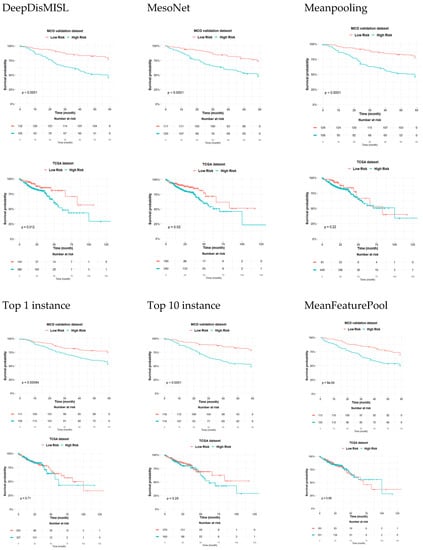 Figure 5 shows that DeepDisMISL provided the best risk stratification for both the MCO and TCGA populations. Among all the studied deep learning algorithms, DeepDisMISL provides the most statistically-significant separation of the survival curves between the high- and low-risk groups in both the MCO and TCGA populations (p < 0.0001 in MCO and p = 0.01 in TCGA). That is, DeepDisMISL identified that the high-risk subgroup presented significantly worse overall survival compared to the low-risk subgroup. MesoNet-identified risk groups also showed apparent separation for survival, but with slightly larger p values (p = 0.001 in MCO and p = 0.02 in TCGA) compared to those based on DeepDisMISL. However, the other baseline algorithms (Meanpooling, Maxpooling with top 1 instance, Maxpooling with top 10 instances, and MeanFeaturePool) only provided clear risk stratification in the MCO CRC (training) dataset. In the TCGA COAD READ (external validation) dataset, no statistically significant separation was observed for these baseline algorithms.