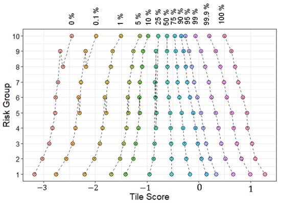 Relationship between the average tile score at each percentile and the risk. Patients are stratified into 10 different risk groups.