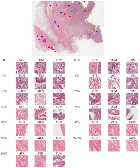Visualization of the spatial locations and morphologic features of tiles near different percentiles in a whole slide image. The thirteen different colors represent thirteen percentile locations. Three neighborhood tiles at each percentile are selected for visualization, and the tissue type of each tile is predicted by a published CRC tissue classifier.