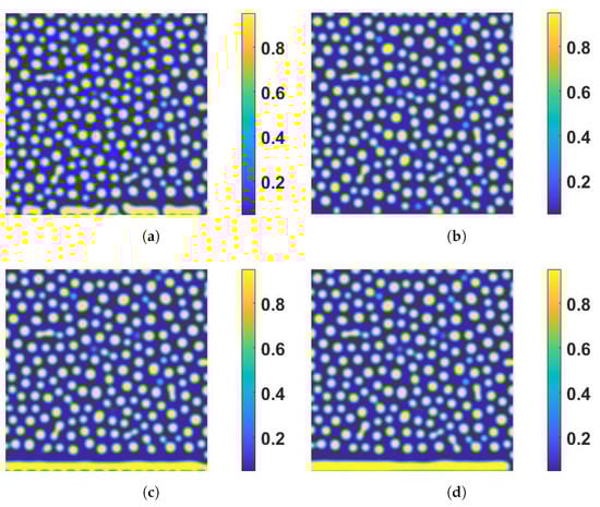 The numerical examples presented next are intended to showcase the effect of boundary reactive dynamics on the bulk dynamics at a set of parameter values. To explore the solution behavior of the model, a comprehensive study is needed which we will defer to another study. In the first simulation, we show the time evolution of spinodal decomposition of the binary polymer system with homogeneous Neumann boundary conditions at all four sides in Figure 1a–c. In the second simulation, we set the homogeneous Neumann boundary condition at and the dynamic boundary condition at with and present the solution in Figure 1d–f. In the third one, we use with the same set of boundary conditions as in the second simulation and show the solution in Figure 1g–i. The first case decouples the bulk dynamics from the surface ones. The second case includes the coupling between the surface dynamics and the bulk dynamics without surface reaction. The third case includes reactive surface dynamics in dynamic coupling. Comparing the three simulations, we find that the dynamic boundary condition on the surface affects the bulk dynamics noticeably due to the non-negligible volume fraction flux (inward or outward) across the surface. The enhanced surface reaction on the boundary accelerate the merging of the droplets in the bulk in Figure 1g–i.