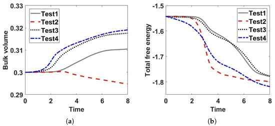 Time evolution of the bulk volume fractions in (a) and the total free energy in (b) with respect to the four tests in Figure 2. We find the bulk volume fractions increase with time in tests 1, 3, and 4, which are related to the merging droplets or lamellar in Figure 3a,b,d. Since there is a leakage of bulk volume fraction in test 2, we do not find any large droplets or lamellar in Figure 3b. The total free energy in each test decays in time as expected.