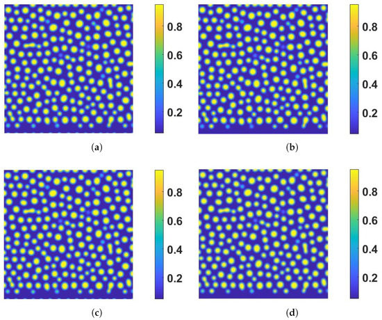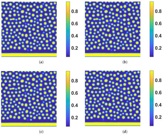 In the numerical treatment of the coupled PDE system, we use the energy quadratization technique coupled with the Crank–Nicolson method in time with time step , and the second order finite difference method on staggered grids in space with spatial mesh size in both x and y direction to obtain a thermodynamically consistent numerical algorithm. The numerical algorithm guarantees that the total energy dissipates in time. For more details about the algorithm please refer to our previous papers [7,56,57]. We use the following initial condition in the simulations