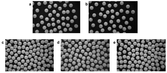 Figure 2 presents a series of movie snapshots displaying the different phase states that we have detected in our experiments for two different packing fraction values ( for the first row, for the second row). For each packing fraction, snapshots are placed in ascending order of fan power. For and the lowest fan power, a subset of particles is still static, because the turbulent vortexes intensity is not strong enough so as to overcome static friction. We denote this static phase as arrest phase due to its static nature. It corresponds to the upper right corner in Figure 2a. Interestingly, the arrest phase has been detected before in analogous configurations [4] and is known to develop a quasi-static ordered state that has been denoted as collapse phase. If current intensity is high enough, however, a subset of the spheres can activate its thermal-like movement (that, as we discussed, is due to the turbulent vortexes generated by the upflow past the spheres). Their movement is initially limited so that we can observe caging effects for these particles (bottom left section in Figure 2a). Thus, we have detected coexistence between the arrest phase and a glass phase for the caged moving particles (Figure 2a). The arrest phase eventually disappears as particles gradually activate, giving rise to a pure glass phase and afterward (at stronger upflow intensity) to the coexistence of the glass–liquid phase (for this coexistence, see Figure 2b, with the glass phase occupying the lower-density region in the upper right corner of the snapshot). At higher density (, we observe consecutively: liquid phase (Figure 2c), liquid–crystal coexistence (the crystal is hexagonal, see the developing hexagonal structure, with some defects, in bottom right corner in Figure 2d), and crystal–liquid phase (Figure 2e). At this point, if the fan power is still increased, there is gradual shrinkage of the hexagonal crystal (which melts). The crystal completely disappears above a threshold value of air-current intensity. At this point, only the liquid remains (again). This last stage is not represented because they look much like the snapshots in Figure 2c,d. In any case, grasping the phase configuration out of these snapshots is not straightforward, and for this reason, we analyze in more detail the particle trajectory structure in the next section.