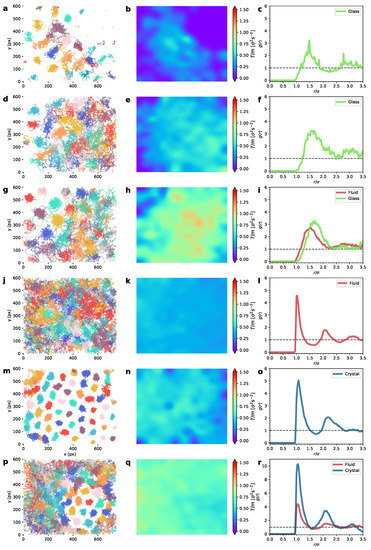 These results are illustrated in Figure 3. This figure shows, for a representative set of experiments, the particle trajectories in the left column, the 2D color maps of the granular temperature in the middle column, and the pair correlation function in the right column. The experiments shown in Figure 3 correspond to two different densities (low, with , and high, with ), with each subset in an ascending order of the upflow-current intensity. In it, we can see the phases that consecutively appear as more energy is input into the system. Figure 3a shows two qualitatively different types of arrangements of particle-trajectory phases: a disordered lattice of caged particle trajectories (caged in the sense that the moving particles remain close to a disordered set of fixed points) and a disordered lattice of static particles (arrest phase). In effect, the former set of trajectories can be identified as a glass phase because, although the particles undergo a continuous stochastic movement, the caging effects are predominant [68,69] and a disordered but permanent particle trajectory structure (lattice) can be observed. To the best of our knowledge, it is not very common to find glass transitions at such low densities. With respect to the latter, it is apparent that the particles remain static during the complete 100 s experiment. From this qualitative difference between these two phases, a strong energy non-equipartition emerges. In effect, as we can see in Figure 3b, the region corresponding to the arrest phase has a vanishing granular temperature T, whereas for the glass phase T is clearly non-null. Note that, contrary to what has been observed in the thin layers, we have not detected a static phase that yields a hexagonal-ordered collapse phase, as in a vertically vibrated monolayer of spheres [4]. This peculiar arrest phase, which is also present in a vibrated granular monolayer [32], disappears here gradually as the upflow current increases, to a point where we can observe the two-phase coexistence between the glass-like and liquid-like phases, as in Figure 3c, where the liquid phase is observed in the region where all the trajectories mix and cross each other during the experiment; this is in contrast to the disordered pattern of the localized trajectories visible in the upper left corner. Figure 3d–f show a fully developed glass phase at a low density (). Figure 3g–i, at a higher temperature, show the glass-and-liquid phase coexistence. The curves for the glass phases (see the green curves in Figure 3c,f,i) do not help to distinguish the glass phase from the liquid phase. We will have to resort to the peculiar dynamic properties of the glass for that matter (the mean-squared displacement and velocity autocorrelations) [68]. As we can see in Figure 3e,h, the energy non-equipartition is strong here again, with the glass phase being noticeably cooler. At a higher density (packing fraction ), we observe, consecutively, a monophase liquid-like system (Figure 3j–l); a developing hexagonal crystal which almost occupies the entire region (Figure 3m–o) and whose shows a higher first maximum; and a two-phase system, with a liquid coexisting with a hexagonal lattice (Figure 3r). With respect to the corresponding behavior of their pair correlation function, , the curves for the liquid and the crystal are noticeably different, with the curves for the crystal having stronger secondary peaks, as usual [35]. With respect to , notice also that the non-equipartition is also present in the case of the liquid–crystal two-phase system, with the crystal colder than the liquid (Figure 3h).
