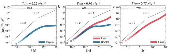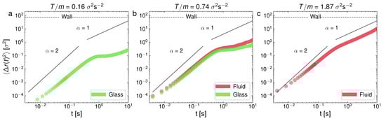 Log–Log representation of the mean-squared displacement for three representative experiments of , for different T: (a) ; (b) ; (c) . Case (b) corresponds to the state shown in Figure 3i,j.