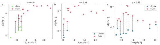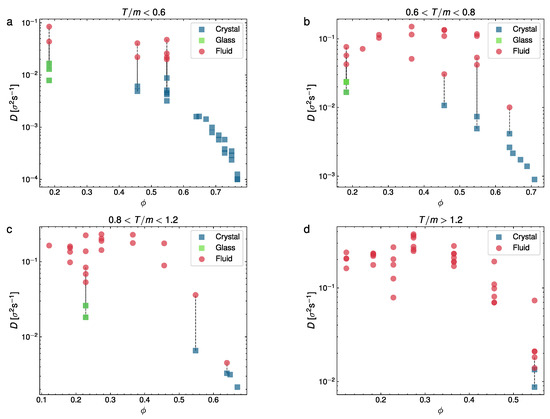 Figure 6 highlights the diffusive stages of the different phase configurations, including those with a phase coexistence (the coexisting phases are here joined with dashed vertical lines). As we can see, at (top left panel), the diffusion coefficient generally tends to decrease with an increasing . Moreover, only glass or liquid phases are visible at a very low T, with the liquid coexisting with the glass at low packing fractions, whereas at intermediate packing fractions, we find the crystal–liquid coexistence and at a larger only the crystal is detected, in this case with the lowest D values. At higher intermediate temperatures (at , in the top right panel, and at , bottom left), we can see the glass–liquid at a low density and again the effects of a larger T cause the withdrawal of the crystal–liquid coexistence at an intermediate , leaving the liquid (red symbols) alone. Again, at a higher , the crystal–liquid and crystal are detected. Finally, in the largest range of values of T, it is apparent that only the liquid is observed (except for a configuration with the densest system we used) and that in this regime the diffusion coefficient is nearly constant with respect to the packing fraction, except for a steep decay at a large (where the only two cases of coexistence with a crystal are observed). It is also interesting to note that an extrapolation of the curve averaged by the crystalline states extends to the low-density glass transition zones. In summary, D tends to decrease for denser systems, except at a very high T, where it tends to keep approximately constant.