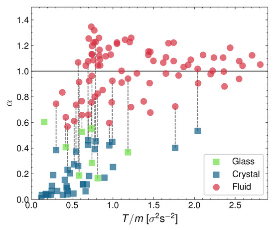 As we mentioned before, previously to computing the diffusion coefficient, we determine the diffusive exponent as defined by Equation (2), and whose value defines if the system is under superdiffusion (), subdiffusion (), or normal diffusion () [70,72]. So, we plot in Figure 8 the measurement of for all the performed experiments altogether. They are represented as a function system granular temperature T for all the particle densities combined (here represented in the form of the packing fraction ). The red points signal the liquid-phase diffusive exponents, green stands for the glass phase, and blue for the crystal. Note the logical order of by the phases, with the crystal having the lowest values, the glass in the intermediate region, and the liquid having the largest . Moreover, as we can see, the crystal and also the glass phases are very subdiffusive. The liquid, however, can be either weakly subdiffusive or weakly superdiffusive. The superdiffusive values () are reached after the phase coexistence has vanished, i.e., the pure-liquid phase tends to be superdiffusive, which we think is an indication again of the repulsive forces between the particles. Especially at not large densities, the repulsion between the particles may aide the particles diffuse in between the neighboring particles, thus enhancing the diffusion.