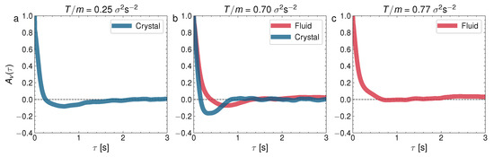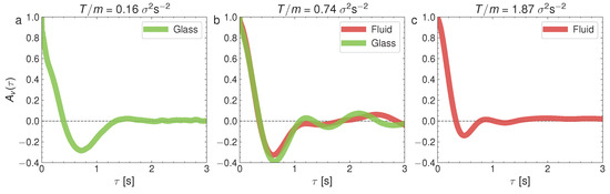where stands for the ensemble averaging over all the steady states at initial times . Figure 9 represents the velocity correlations in the glass–liquid transition and Figure 10 represents for the crystal–liquid transition. It is to be noted that the particles in the glass phase (the left panel in Figure 9) show strong velocity anticorrelations at early times () and that these anticorrelations are transmitted to the coexisting liquid (the center panel of Figure 9). Surprisingly as well, the depth of the anticorrelation well is increased in the glass–liquid two-phase system, with respect to the pure glass (the left panel). Furthermore, the liquid remains anticorrelated at even when the glass has disappeared at a high T. By contrast, the pure-liquid phase does not display the autocorrelations in the crystal–liquid transition (the right panel in Figure 10), as well as an increase in the time required for the autocorrelation function to cancel for the first time. However, there are weaker anticorrelations in the pure crystal (the left panel in Figure 10) and the crystal–liquid two-phase state, and a very short time for the first cancellation of the autocorrelation function, typical of the crystal phase. Let us remark here that the right panels in Figure 9 and Figure 10 combined reveal that the liquid phase has a variety of internal behaviors. This variety of behaviors is closely related to the occurrence of the glass transition at low densities because, as mentioned before, at low densities there is a repulsive interaction between the particles mediated by the upward air flow (as if they had a soft core with a diameter greater than that of the balls), and when the density is increased, this effective potential does not prevent the direct collision between the spherical balls.