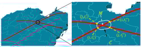 As shown in Figure 1, in the adjacent area C of M, we have . Thus, if conflicts with , and also conflicts with , then for any , there exists for which conflicts with . These conflicts can be called conflicts derived from point M, and we can express the whole of the conflicts derived from point M as . Similarly, the set of all aircraft collisions can be expressed as the set of mutually disjoint ,