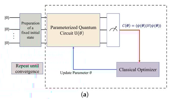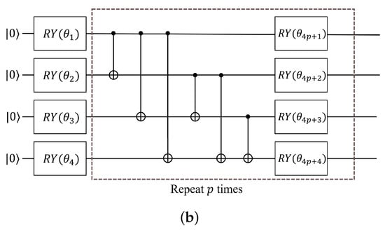 As shown in Figure 2a, we use the cost function to optimize the parameter through a classical optimizer and continue to iterate until convergence is reached. Specifically, the parameterized quantum circuits (PQC) we use in this paper are the commonly used hardware efficient ansatz, which is able to somewhat reduce the circuit depth required to implement [23,24]. For a quantum circuit consisting of n qubits, we first apply the RY-gate once to each qubit, then apply the CNOT-gate (i controls j) to all qubits satisfying , and finally apply the R-gate again to each qubit, repeating the last two steps p times, where p is the number of layers. We also plotted a quantum circuit of a p-layer PQC containing four qubits (Figure 2b).