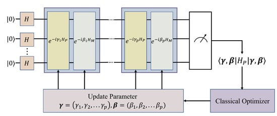 What is used in QAOA is an alternating structure ansatz, often referred to as the quantum alternation operator ansatz [28]; the adiabatic evolution is replaced by p alternate time propagations between and . As shown in Figure 3, in the p-layer QAOA, the initial state is , the evolution time interval is treated as a variational parameter, i.e., , and the two Hamiltonians are applied alternately p times.The variational form of QAOA is defined as