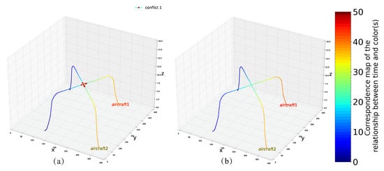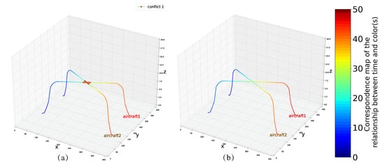 In the last example, we solve another example of the problem using 10 qubits (details of the conflict are shown in Figure 4d). Unlike example 1, in this example we take to test the availability of the model, whereas is still set as 2. The minimum energy obtained by two algorithms separately is and , while the total delay of the two aircraft is and , respectively. Similarly, we have plotted the routes of the two aircraft before and after optimization (Figure 8).