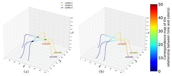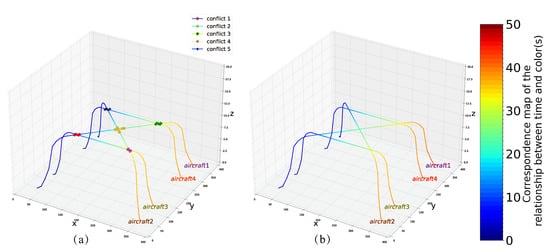 Here, we use 12 qubits to solve the collision example of four aircraft containing five pairs of conflict, corresponding to the details of the conflicts and the routes shown in Figure 4c and Figure 7a. We obtain a minimum energy of , the optimal solution is , and the total delay time of the four aircraft are (the optimized routes are shown in Figure 7b).