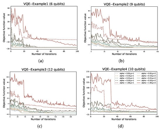 The objective function values corresponding to the number of iterations of VQE at different and p in the four examples; (a–d) represent examples 1–4, respectively.
