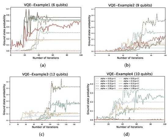 We first compare the objective functions of the original VQE and CVaR-VQE during the iterative process. In Figure 9 and Figure 10, we plot the probability of the objective function values against the optimal solution, respectively. It is obvious from Figure 9 that when we choose , the number of iterations required to converge the objective function value to the ground state energy is significantly lower than the original VQE. To take example 1, which uses six qubits, in Figure 9a, the original VQE does not reach the ground state energy until the 100th iteration, whereas even the slowest convergence, , reaches convergence at about the 70th iteration. And as the number of qubits increases, the performance of CVaR-VQE is still superior to the original VQE, although it also decreases. For the ground state probability , the number of iterations required for to converge increases as the value rises, but even in example 3, which has the highest number of iterations, CVaR-VQE still has an advantage in the number of iterations required for the ground state probabilities and the objective function value to reach convergence.