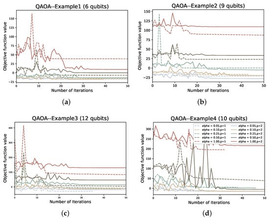 The objective function values corresponding to the number of iterations of QAOA at different and p in the four examples; (a–d) represent examples 1–4, respectively.