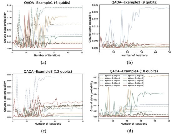 As the depth p increases and decreases, we find that there is a certain improvement in both the objective function value and the ground state probability of QAOA (as shown in Figure 11 and Figure 12). However, overall, the convergence rate of QAOA is still very slow and the ground state probability is generally very low, with the highest still less than . When we optimize, most QAOA ends when the number of iterations reaches 50. Compared to the VQE, the performance of QAOA is inferior. Without considering the impact of the classical optimizer, one of the important reasons for our analysis is that the hardware efficient ansatz is used in the VQE. A VQE of depth p contains variational parameters and additional control gates, whereas the QAOA has only variational parameters. Therefore, if we want to improve the performance of QAOA, increasing the depth p is an effective way. However, this will also inevitably lead to an increase in the solution time. Due to the current NISQ devices, it is still difficult to successfully implement quantum circuits with excessive depth. It has been shown in some previous studies that when NISQ devices run quantum algorithms, the fidelity of the quantum state prepared by the quantum program and the minimum expected value of the Hamiltonian will be affected because of the existence of noise, which makes the results have deviations [29].