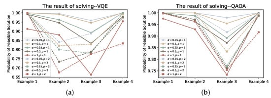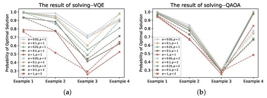 In the solution process, first we encode the problem in the form of Equation (31), then map to get the Ising Hamiltonian , and then use VQE or QAOA to find the ground state. We use the gradient-free optimizer linear approximation constrained optimization (COBYLA) optimizer to optimize the variable parameters of PQC for the solution of all four examples. For each example, we tested the performance of QAOA versus VQE for and .