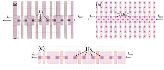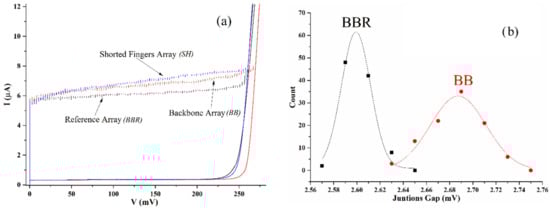 A comparison between the three arrays of Figure 1 is shown in Figure 2. In Figure 2a, we see that the current–voltage characteristic of a backbone array has higher Josephson currents and higher gap-sum voltage with respect to the reference array, a result consistent with those reported in previous papers [13,14]. In this figure, however, we also show the current–voltage characteristics of the backbone array with superconducting shorts of Figure 1a. We can see that for this array, the Josephson currents are, up to 100 mV, equal to the currents of the backbone array, and after this voltage, the “shorted fingers” array has higher Josephson currents. Note that the sort of “grass” appearing on the switching distributions of the samples does not depend on the noise of the measurement apparatus, but it is an intrinsic characteristic of the junctions of the arrays having slight barrier/geometrical defects generating quasi-particle current dispersion which adds to the Josephson currents when measuring the series connection.